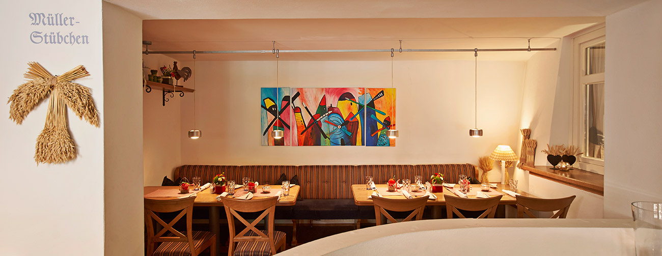 Räumlichkeiten Windmühlenstube Eine runde Sache Die runde Windmühlenstube mit ihren 40 Plätzen ist wohl einzigartig in der gesamten Region ... Weiterlesen Kaminstube Holz und viel Gemütlichkeit Viel Holz, inklusive des großen massiven Stammtisches - für ein Abendessen mit Freunden oder der Familie ... Weiterlesen MüllerstübchenPlatz mit dem Mühlencharakter Unser Müllerstübchen liegt etwas separat und durch den offenen Blick ins Kaminzimmer fühlt sich der Gast ... Weiterlesen Terrasse Ein Platz an der Sonne Was gibt es Schöneres als an warmen Sommertagen Kaffee und Kuchen oder an lauen Abenden ein Wolfsbarschfilet ... Weiterlesen